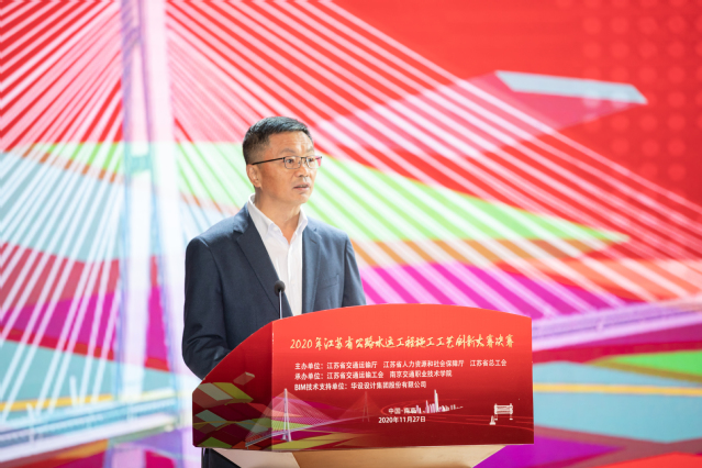 省交通运输厅副厅长丁峰在开幕式上代表省交通运输厅向进入决赛的各位参赛选手表示热烈祝贺。他指出,在全面贯彻落实党的十九届五中全会精神,奋力推进交通强国建设的新征程中,江苏交通的高质量发展已成为江苏奋力打造交通强国示范区,加快推进“强富美高”新江苏建设的“先行力量”。他表示,打造交通品质工程样板是落实好《交通强国江苏方案》的重要任务,江苏交通将立足“十年路面百年桥”的品牌优势,进一步树立涵盖全寿命周期、可持续发展和适用服务等内容的品质工程新理念,建立健全以“标准化、信息化、绿色化”为核心的一整套具有鲜明特色的江苏公路水运品质工程政策、标准和制度体系,通过项目示范引领,树立行业标杆,全面打造江苏公路水运品质工程。