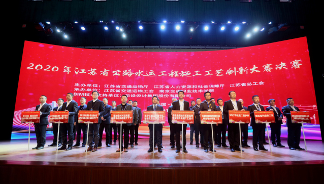 各主办单位、承办单位领导共同按下启动柱,宣布2020年江苏省公路水运工程施工工艺创新大赛决赛正式开始。