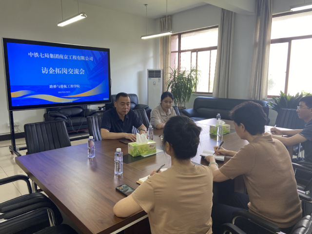 为扎实推进访企拓岗促就业专项行动,进一步深化校企交流合作平台建设,促进毕业生高质量就业,6月8日,路桥与港航工程学院联合中铁七局集团南京工程有限公司在修远楼318举办访企拓岗交流会。路桥与港航工程学院院长蒋玲、学工办主任黄阿梅、专任教师杨丙文,中铁七局集团南京工程有限公司人力资源部部长魏永斌、副部长王君参加交流。