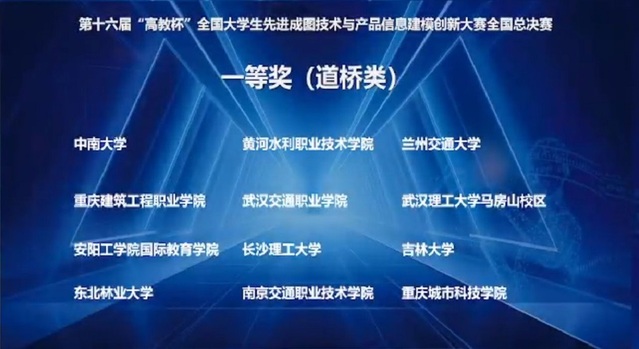 7月29日上午,第十六届“高教杯”全国大学生先进成图技术与产品信息建模创新大赛在重庆交通大学和重庆建筑工程职业学院隆重举行。大赛分为机械类、建筑类、道桥类和水利类四个类别,主要围绕增材制造、轻量化设计、数字化创新设计、产品创新设计、BIM创新应用、桥梁数字化设计等赛道内容进行竞赛。本次大赛共吸引了来自全国740所高校的1188支参赛队伍参赛,本、专科学生同场竞技,经过三天激烈的角逐,我校路桥与港航工程学院代表队张权、孙雨泽、殷伯林、杨悦、刘朝阳、蔡瀚鋆、孙嘉怡、马琦等8位同学(指导老师:郭景全、陈亮、杨丙文、田艳娟、孙亭亭)荣获道桥类团体一等奖。