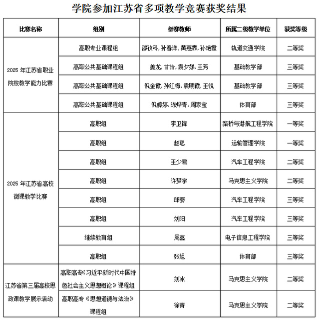 近日,江苏省多项教学竞赛评选结果陆续揭晓。我院教师积极踊跃参与,在各类赛事中斩获多项荣誉,充分展现了我院教师队伍优秀的教学水平和良好的精神风貌。