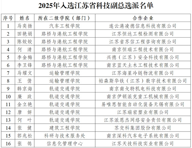 近日,江苏省委人才办、江苏省科技厅公布了2025年江苏省科技副总选派名单(苏科区成发〔2025〕172号),学院共有16名教师入选,入选人数名列全省高职院校前列。