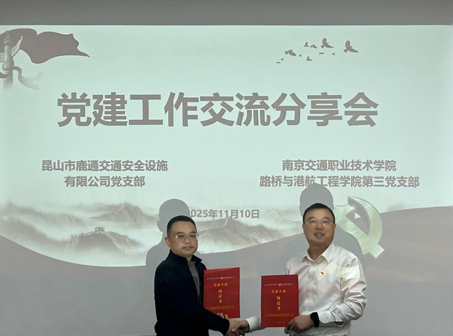 为深入学习贯彻党的二十大精神,推动党建与业务深度融合及校企协同育人,2025年11月10日上午,路桥与港航工程学院第三党支部与昆山市鹿通交通安全设施有限公司党支部举行党建共建签约仪式暨首次联学活动,双方党员代表及企业骨干代表共二十余人参加。