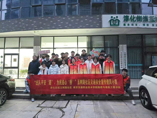 12月24日下午,路桥与港航工程学院联合江宁区淳化街道玉树路社区,在社区党群服务中心及小区出入口成功举办主题为“出入平安‘路’,为民连心‘桥’”的交通安全宣传便民活动。辅导员吴连合带领10余名学生志愿者参与,旨在结合专业特色提升居民安全意识,深化学生实践能力。